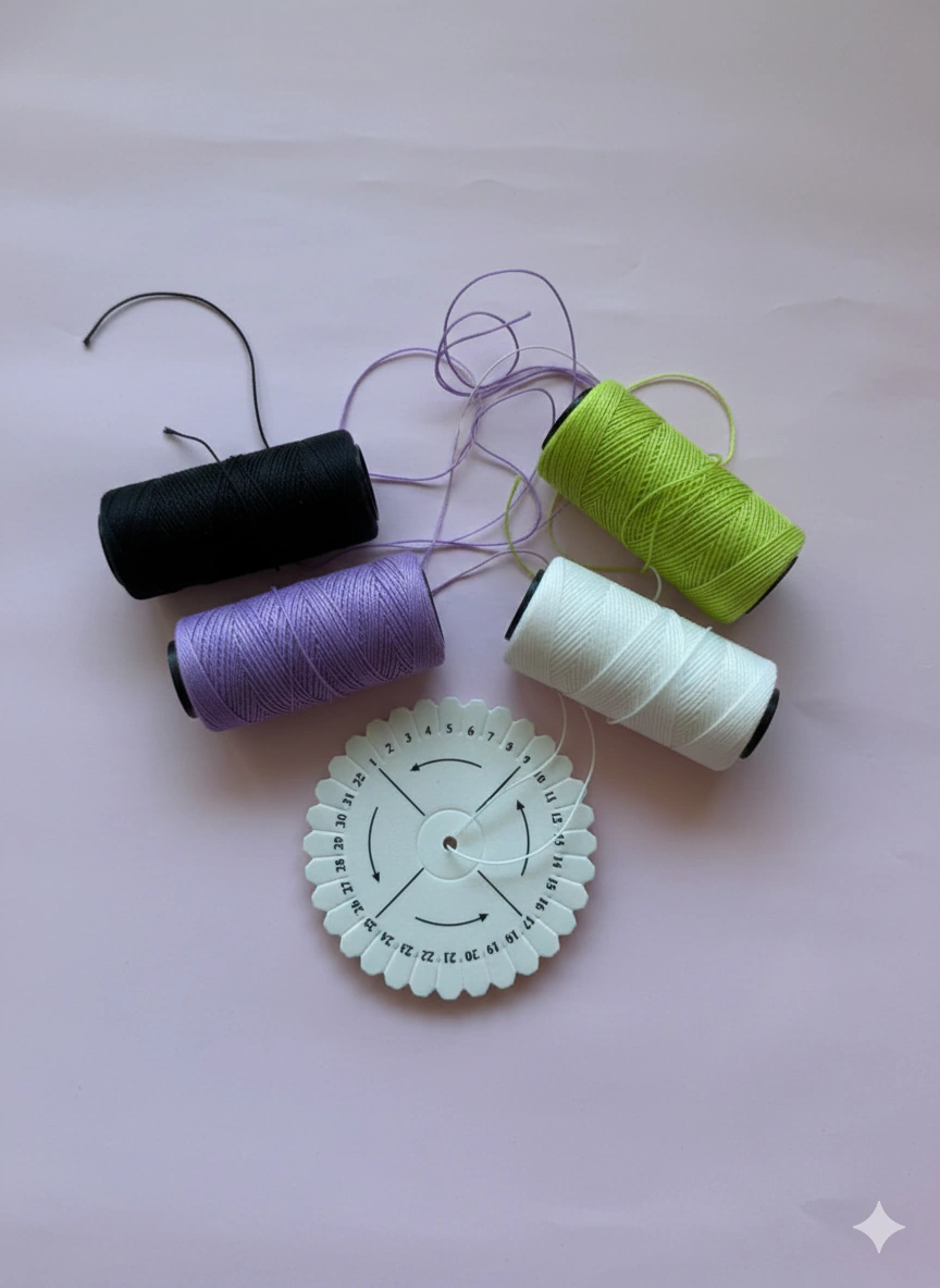 El kit Incluye 4 hilos de macramé a elección y 1 telar Kumihimo.